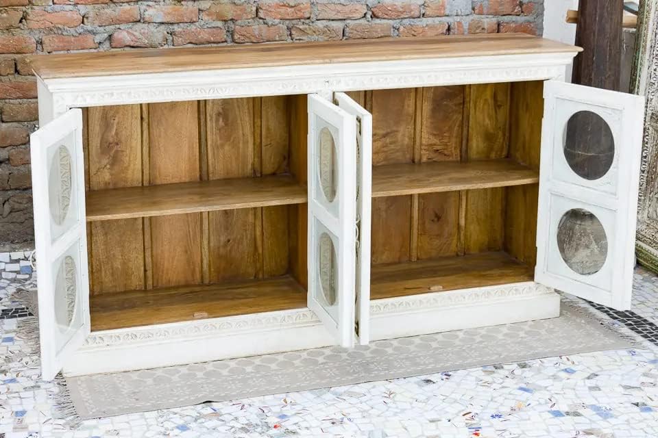 Antique Indian Brass Hand Carved Solid Wood Dining Sideboard Powder Coated Mango Wood Indian Arched Dining Sideboard Cabinets Storage Units Indian Solid Wood Veneer for Living Room Bedroom Furniture, Modern Dining Sideboards