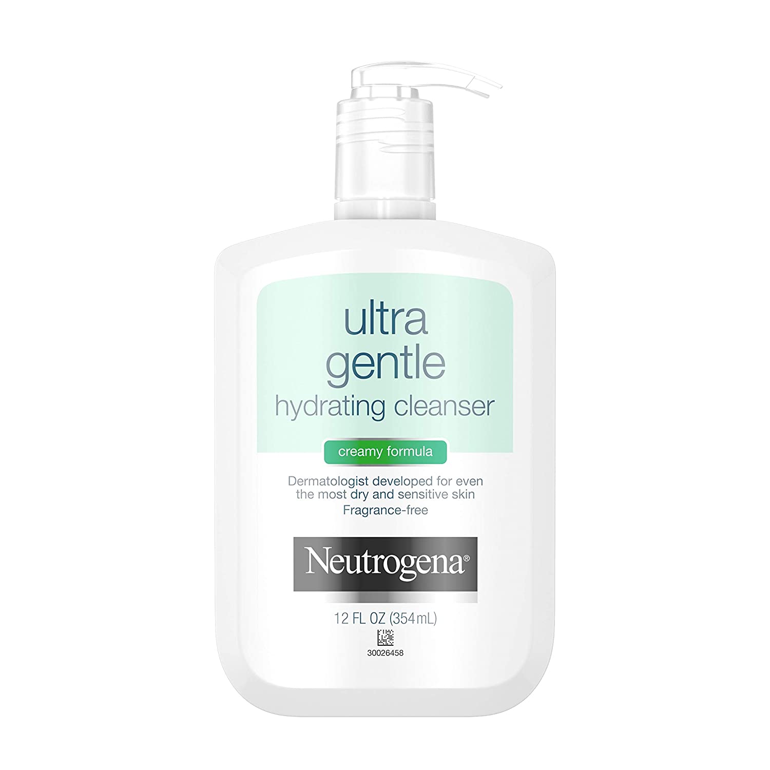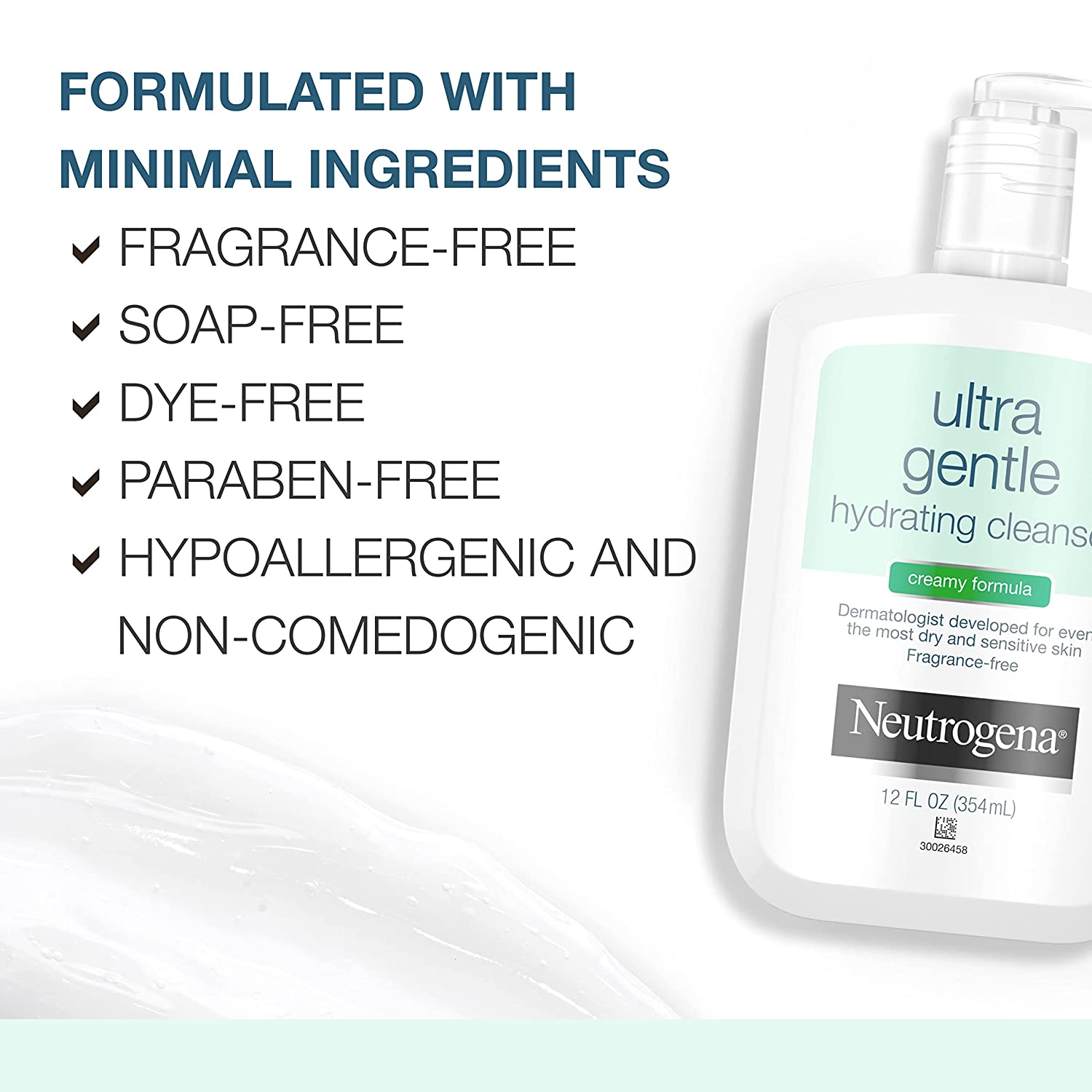 Neutrogena Ultra Gentle Moisturizing Daily Cleanser for Sensitive Skin, Acne, Eczema, and Rosacea, Oil-Free, Soap-Free, Hypoallergenic, and Non-Comedogenic Creamy Cleanser, 12 Fluid. Ounce
