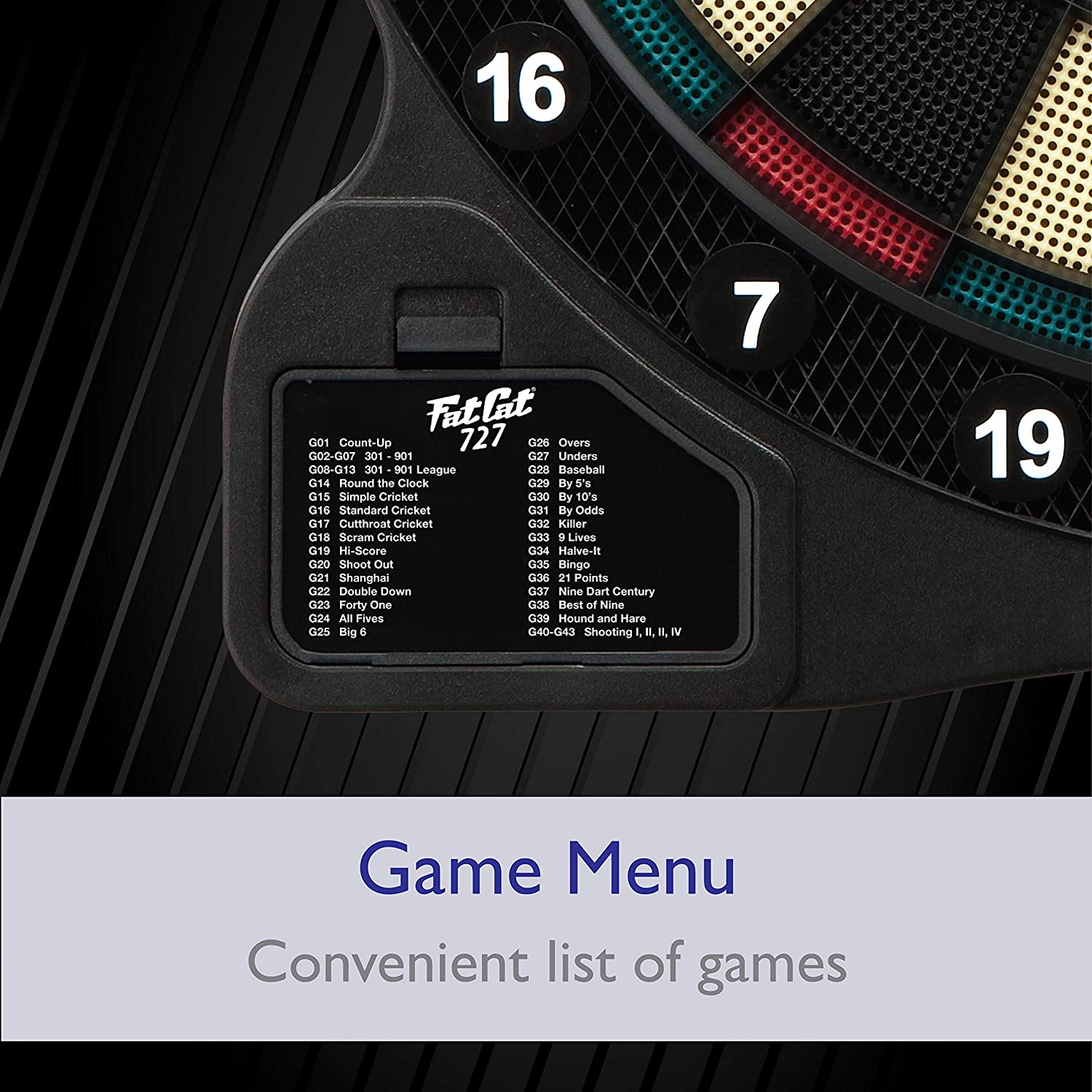 Fat Cat 727 Electronic Dart Scale from GLD Products Value Size More than 15 games and 132 choices Automatic scoring Compact display with leaky dart throw catch ring Soft-tip darts and extra points Battery-powered, multi-color, one size
